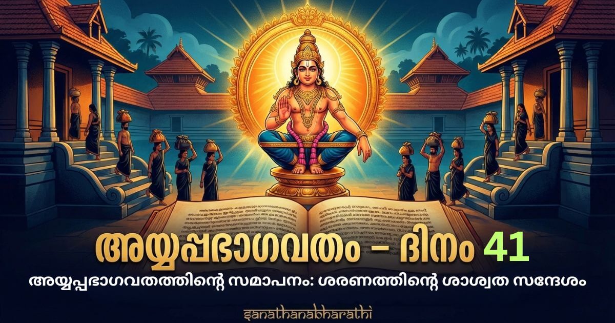 അയ്യപ്പഭാഗവതത്തിന്റെ ഈ ദിവ്യയാത്ര സമാപനത്തിലെത്തുമ്പോൾ, ഭക്തന്റെ ഹൃദയത്തിൽ അവശേഷിക്കുന്നത് ആഴത്തിലുള്ള ശാന്തിയും ആത്മീയ പൂർണ്ണതയും തന്നെയാണ്. മഹിഷിസംഹാരത്തിൽ ആരംഭിച്ച ദൈവികകഥ, ശബരിമലയുടെ ശിഖരത്തിൽ മാത്രമല്ല, മനുഷ്യഹൃദയത്തിന്റെ ആന്തരികതയിലേക്കാണ് എത്തിച്ചേരുന്നത്. അയ്യപ്പഭാഗവതം ഒരു പുരാണകഥയല്ല; അത് ജീവിക്കേണ്ട ഒരു ആത്മീയമാർഗമാണ്.