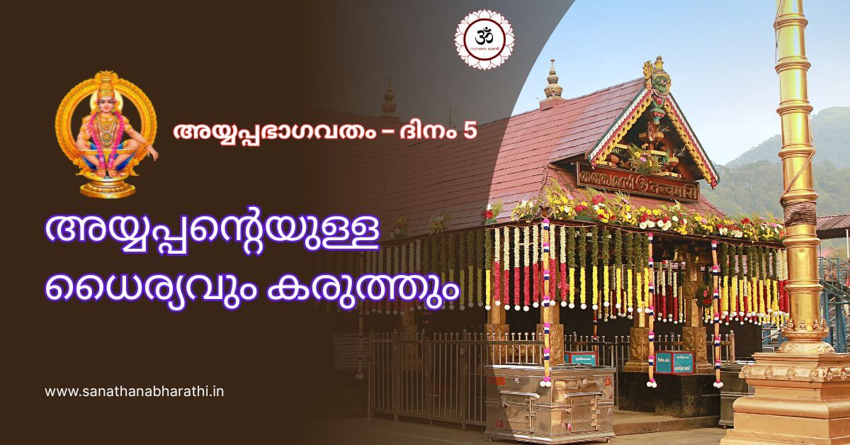അയ്യപ്പസ്വാമിയുടെ ജീവിതത്തിൽ ഏറ്റവും ദിവ്യമായിത്തിളങ്ങുന്ന ഗുണങ്ങളിൽ ഒന്നാണ് അയ്യപ്പന്റെ ധൈര്യം. ഹരിഹരപുത്രന്റെ ബാല്യകാലം മുതൽ തന്നെ ധാർമ്മിക ശക്തിയും ഭയരഹിതത്വവും സമന്വയിച്ച ഒരു ദിവ്യവീരനായിരുന്നു അയ്യപ്പൻ. ദിനം 5 ലേഖനത്തിലൂടെ, അയ്യപ്പസ്വാമിയുടെ അസാധാരണമായ ധൈര്യവും കരുത്തും, അവയുടെ അടിസ്ഥാനത്തിലുള്ള ദിവ്യസങ്കൽപവും നമുക്ക് ആഴത്തിൽ പഠിക്കാം.