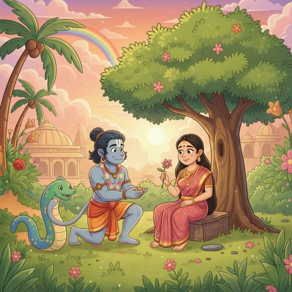 ഒരു കാലത്ത്, ദൂരെയൊരു ദ്വീപിലായിരുന്നു ലങ്ക. അവിടെ സീതാദേവിയെ രാവണൻ തടവിലാക്കി വെച്ചിരുന്നു.